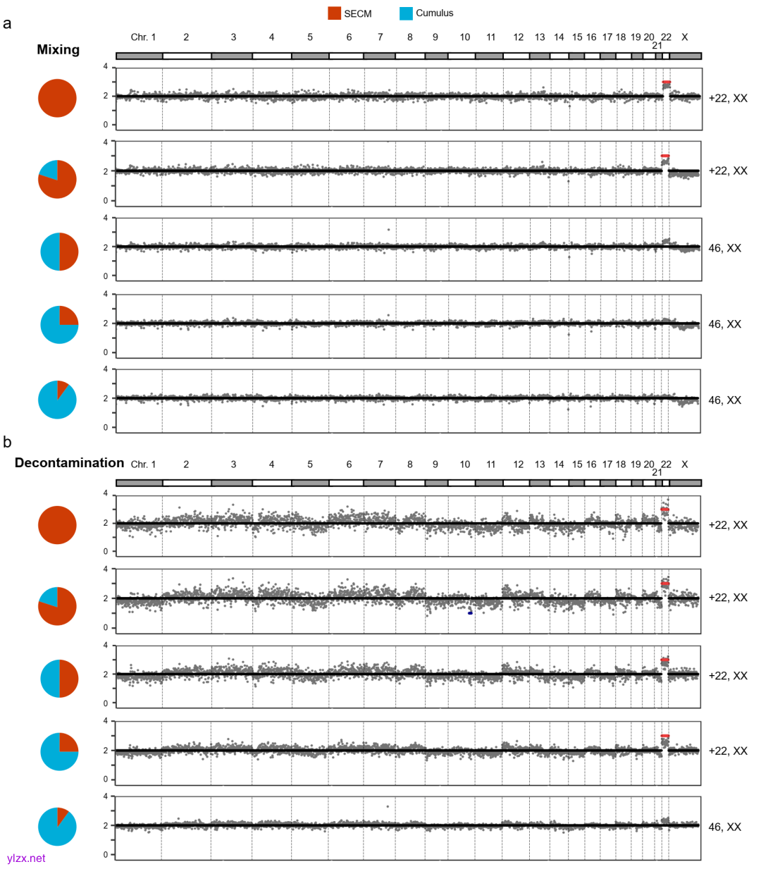 研究团队通过富集未甲基化读段,研究了从不同程度颗粒细胞污染的SECM样本中恢复囊胚DNA染色体拷贝数变异(CNV)的可行性。通过将一个非整倍体SECM样本(+22,XX,无母源污染)的读段与颗粒细胞的读段以四种不同比例(20%、50%、75%和90%)进行混合,合成了一系列模拟的DNA甲基化数据。结果显示,随着颗粒细胞污染比例的增加,非整倍体染色体的信号逐渐减弱;当颗粒细胞污染比例达到50%或更高时,非整倍体无法被检测到(图3a)。随后,研究团队筛选了未甲基化读段以排除颗粒细胞污染,并进行了非整倍体分析。结果显示,在颗粒细胞比例为50%、75%和90%的数据中,非整倍体染色体的数量明显增加,并且在颗粒细胞比例为50%和75%的数据中能够识别出非整倍体染色体(图3b)。