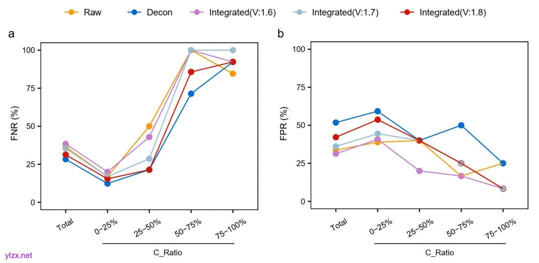 折线图显示不同净化策略下的假阴性率(a)和假阳性率(b)。