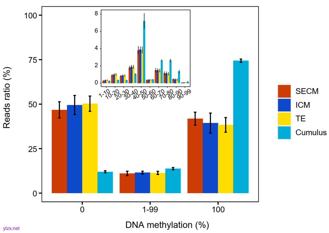 图2. SECM、ICM、TE及颗粒细胞中甲基化分布的特征分析。