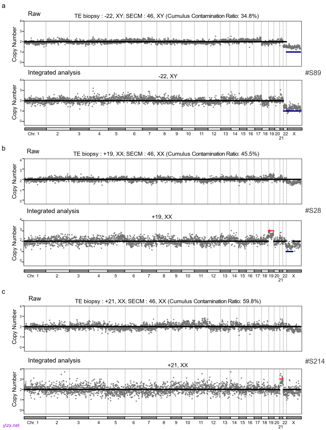 图6展示了三个案例。样本#S89的污染率为34.8%,初始SECM检测结果显示为整倍体状态,而相应胚胎的TE活检结果为−22,XY。经过去污染处理后,SECM检测结果被修正为−22,XY(见图6a)。样本#S28的颗粒细胞污染比例为45.5%,原始SECM的拷贝数结果为46,XX;而相应胚胎的TE活检结果为+19,XX。经过整合去污染前CNV阈值1.8&2.2的去污染操作后,SECM检测结果被修正为+19,XX,与TE活检结果一致(见图6b)。在另一个案例中,样本#S214的污染率为59.8%,原始SECM的拷贝数结果提示为整倍体,而TE活检结果为+21,XX。经过去污染处理后,SECM检测结果被正确修正为+21,XX(见图6c)。