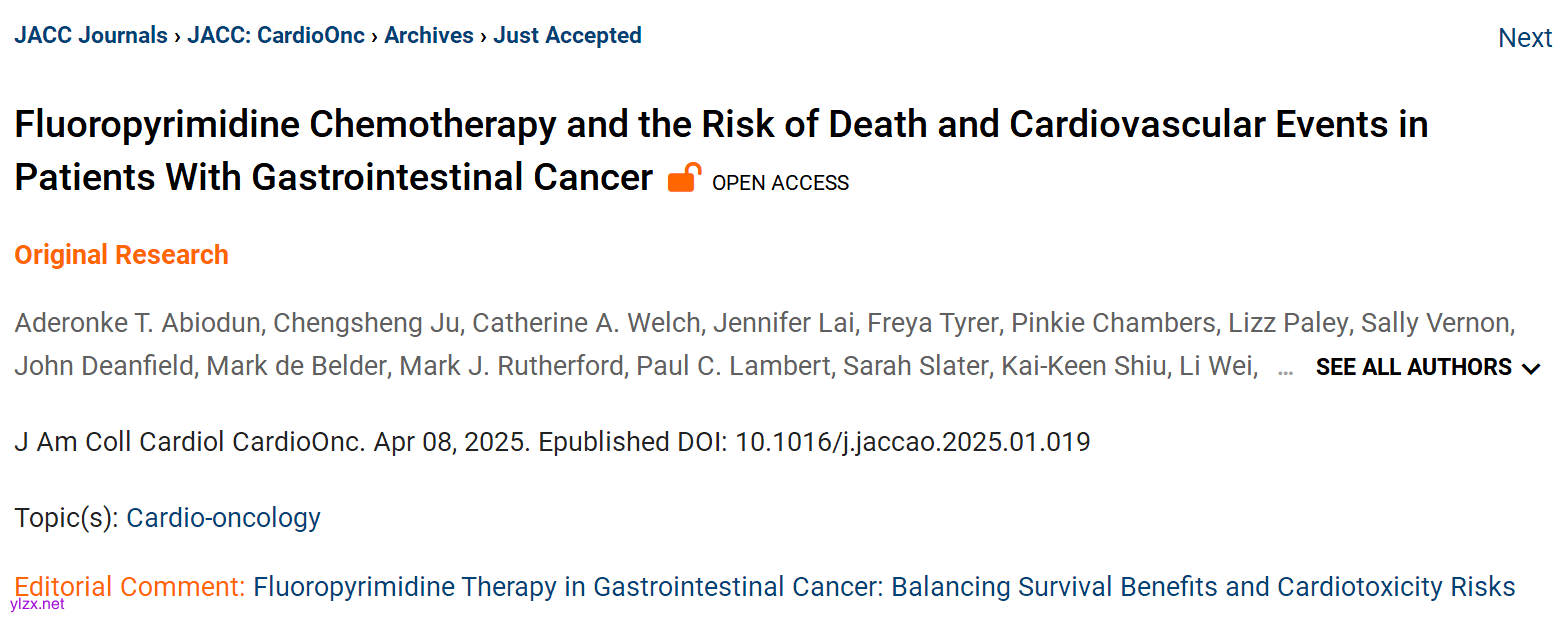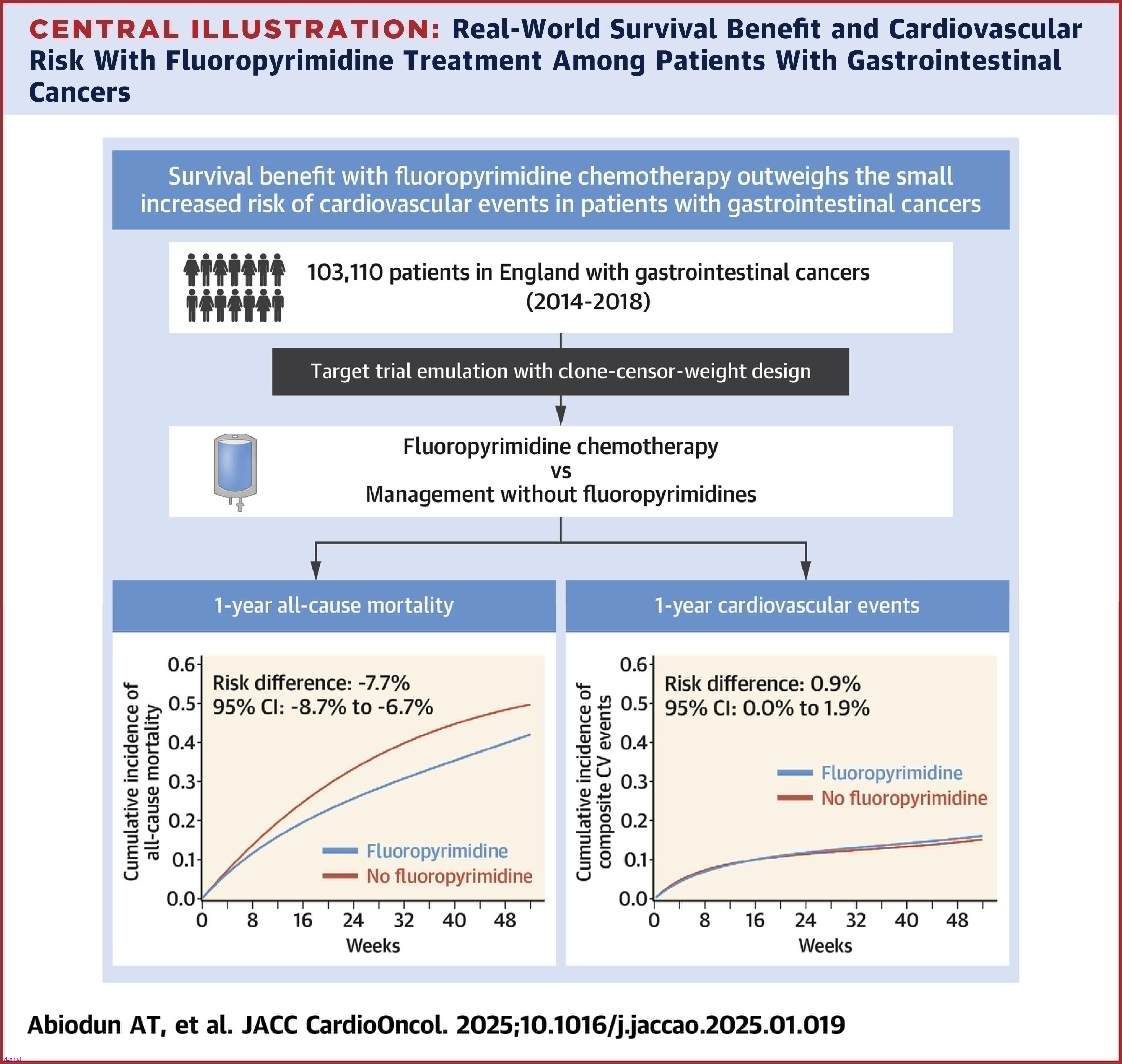 Aderonke T. Abiodun,et al.Fluoropyrimidine Chemotherapy and the Risk of Death and Cardiovascular Events in Patients With Gastrointestinal Cancer.JACC: CardioOncology.2025.https://www.jacc.org/doi/10.1016/j.jaccao.2024.10.014