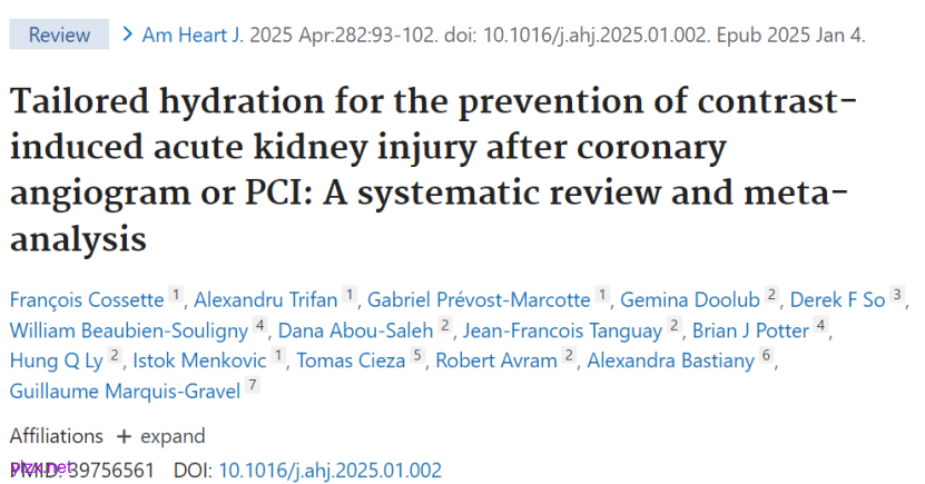 Cossette F, Trifan A, Prévost-Marcotte G, Doolub G, So DF, Beaubien-Souligny W, Abou-Saleh D, Tanguay JF, Potter BJ, Ly HQ, Menkovic I, Cieza T, Avram R, Bastiany A, Marquis-Gravel G. Tailored hydration for the prevention of contrast-induced acute kidney injury after coronary angiogram or PCI: A systematic review and meta-analysis. Am Heart J. 2025 Apr;282:93-102. doi: 10.1016/j.ahj.2025.01.002. Epub 2025 Jan 4. PMID: 39756561.