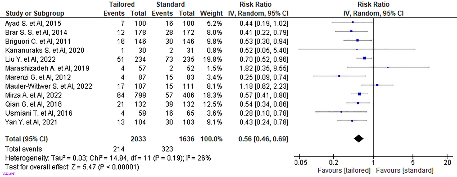 本研究为多中心、随机对照试验的系统性综述与荟萃分析,检索PubMed、Embase及Cochrane图书馆数据库中比较个体化与非个体化补液策略预防CI-AKI的随机对照试验(RCT)。个体化补液定义为基于患者体重以外的至少一项参数(如左心室舒张末压[LVEDP]、尿流率[UFR]或生物阻抗分析[BIVA])调整静脉输液方案。纳入标准包括接受冠状动脉造影和/或PCI的患者,排除未明确补液策略的研究。采用Cochrane偏倚风险评估工具评估文献质量,使用RevMan软件进行随机效应模型分析,计算风险比(RR)及其95%置信区间(CI)。主要结局为CI-AKI发生率,次要结局包括MACE、全因死亡率、肾脏替代治疗(RRT)及肺水肿。亚组分析基于性别、糖尿病状态、慢性肾病(CKD)及手术类型(CAG或PCI)展开。敏感性分析通过排除小样本研究或调整CI-AKI定义进一步验证结果的稳健性。