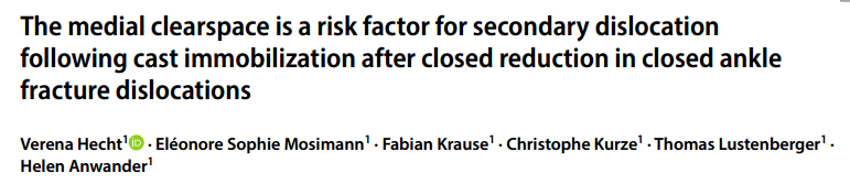 Eur J Trauma Emerg Surg:内侧关节间隙增宽对踝关节骨折脱位闭合复位后继发性脱位的影响