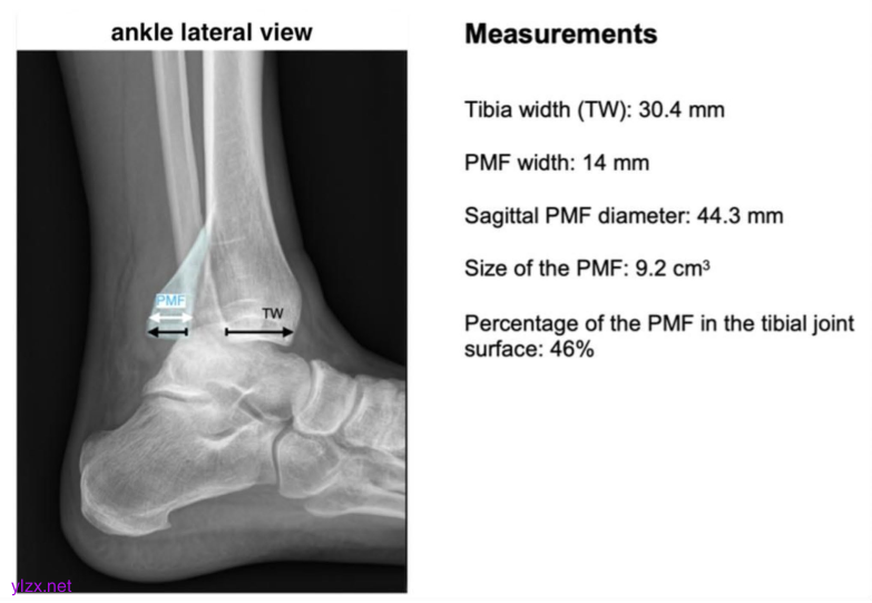 三踝骨折的侧位X线片。PMF宽度与胫骨宽度之比定义了PMF在胫骨关节表面的百分比以及矢状径