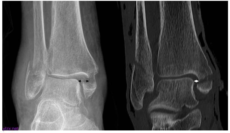 左图显示了处于预还原状态的脚踝。黑色箭头显示内侧间隙扩大到8.3毫米。右图显示计算机断层扫描中踝关节后复位。白色钻石显示测量的内侧间隙为4.2毫米