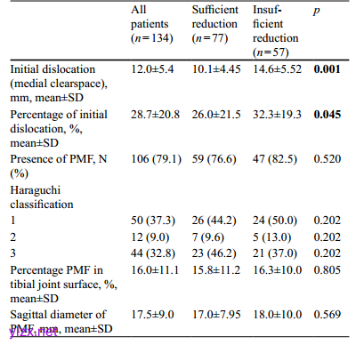 夹板固定过程中复位充分与复位不足患者的PMF结构和初始脱位的比较
