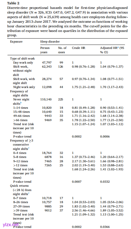 该队列包括60%的护士,40%的护理助理及相关护理专业人员。有5387名员工长期上白班,7312名员工从事不包含夜班的轮班工作,3347名员工从事包含夜班的轮班工作,1377名员工只上夜班。在仅上白班的群体中,年龄较大的员工(50岁及以上)比例最高(53.8%)。研究观察到,与长期上白班的员工相比,在过去六个月中仅上夜班的员工患睡眠障碍的风险更高(HR=1.70,95%CI,1.17~2.43)。与不上夜班的员工相比,在过去六个月中夜班次数超过66次(处于最高四分位数)的员工患睡眠障碍的风险更高(HR=1.77,95%CI,1.21~2.50)。趋势检验表明,随着夜班次数的增加,睡眠障碍的风险也在增加,以每10个夜班的风险来表示为(HR=1.07,95%CI,1.03~1.12)。对上夜班的员工(包括有夜班的轮班工作和仅上夜班的工作)以及不上夜班的员工进行分层分析。在上夜班的员工中,连续3个或更多夜班达到9~12次所带来的风险在统计学意义上处于临界状态。
