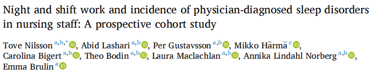 Tove Nilsson, Abid Lashari, et al. Night and shift work and incidence of physician-diagnosed sleep disorders in nursing staff: A prospective cohort study, International Journal of Nursing Studies, 2025, https://doi.org/10.1016/j.ijnurstu.2025.105017.