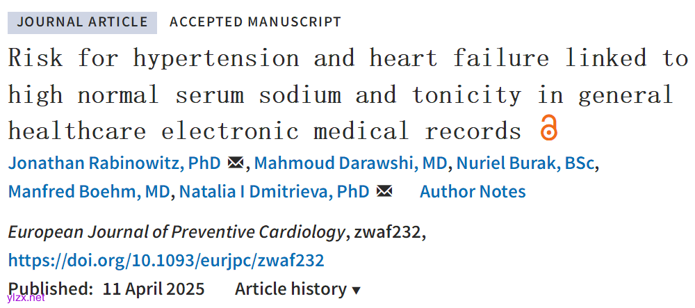 Jonathan Rabinowitz,al.Risk for hypertension and heart failure linked to high normal serum sodium and tonicity in general healthcare electronic medical records.European Journal of Preventive Cardiology.2025.https://academic.oup.com/eurjpc/advance-article/doi/10.1093/eurjpc/zwaf232/8110965