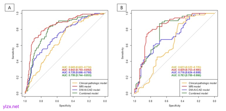 图 开发队列和验证队列中预测模型的受试者工作特征曲线。A 开发队列;B 验证队列。