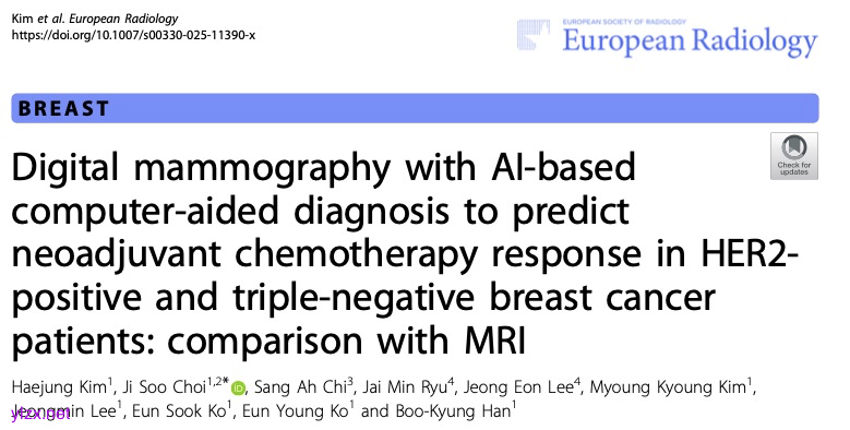 Haejung Kim,Ji Soo Choi,Sang Ah Chi,et al.Digital mammography with AI-based computer-aided diagnosis to predict neoadjuvant chemotherapy response in HER2-positive and triple-negative breast cancer patients: comparison with MRI.DOI:10.1007/s00330-025-11390-x