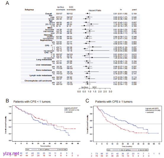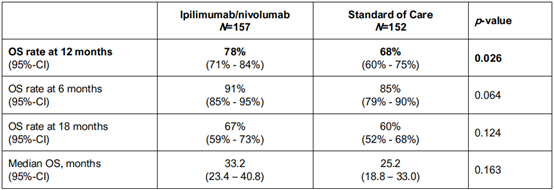 试验共纳入309名患者,其中157名接受伊匹木单抗/纳武利尤单抗治疗,152名接受标准治疗。结果显示,伊匹木单抗/纳武利尤单抗组的12个月OS率为78%,显著高于标准治疗组的68%(p=0.026)。中位OS分别为33.2个月和25.2个月,风险比为0.81(95% CI 0.61-1.09)。PFS在两组之间相似,HR为0.99(95% CI 0.77-1.28)。ORR在联合治疗组为32.8%,显著高于标准治疗组的19.3%。探索性分析显示,PD-L1 CPS评分≥1的患者在OS上有显著优势(HR 0.56,95% CI 0.37-0.86)。