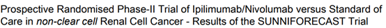 Bergmann, L., Albiges, L., Ahrens, M., Gross-Goupil, M., Boleti, E., Gravis, G., Flechon, A., Grimm, M.-O., Bedke, J., Barthélémy, P., Castellano, D., Mellado, B., Ivanyi, P., Rottey, S., Florcken, A., Suarez, C., Maroto, P., Grunwald, V., Oosting, S. F., Kopecky, J., Zschabitz, S., Boegemann, M., Buchler, T., Niegisch, G., Goebell, P. J., Waddell, T., Joly, F., Priou, F., Retz, M., Siemer, S., Zimmermann, U., Deckbar, D., Burkholder, I., Hartmann, A., Haanen, J. B., Interdisciplinary Renal Cell Carcinoma Working Group of the DKG (IAGN). Prospective Randomised Phase-II Trial of Ipilimumab/Nivolumab versus Standard of Care in non-clear cell Renal Cell Cancer- Results of the SUNNIFORECAST Trial. Annals of Oncology, doi:https://doi.org/10.1016/j.annonc.2025.03.016.