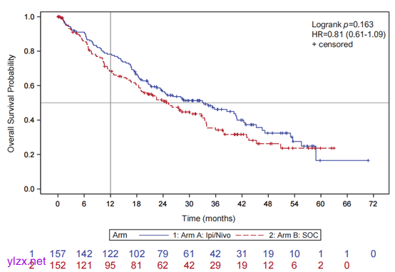 在安全性方面,伊匹木单抗/纳武利尤单抗组和标准治疗组均报告了高比例的不良事件。联合治疗组中,97%的患者出现任何级别的不良事件,87%的患者出现治疗相关不良事件,48%的患者出现严重不良事件。相比之下,标准治疗组中,99%的患者出现任何级别的不良事件,96%的患者出现治疗相关不良事件,39%的患者出现严重不良事件。联合治疗组中有5例致命不良事件,而标准治疗组中有3例。