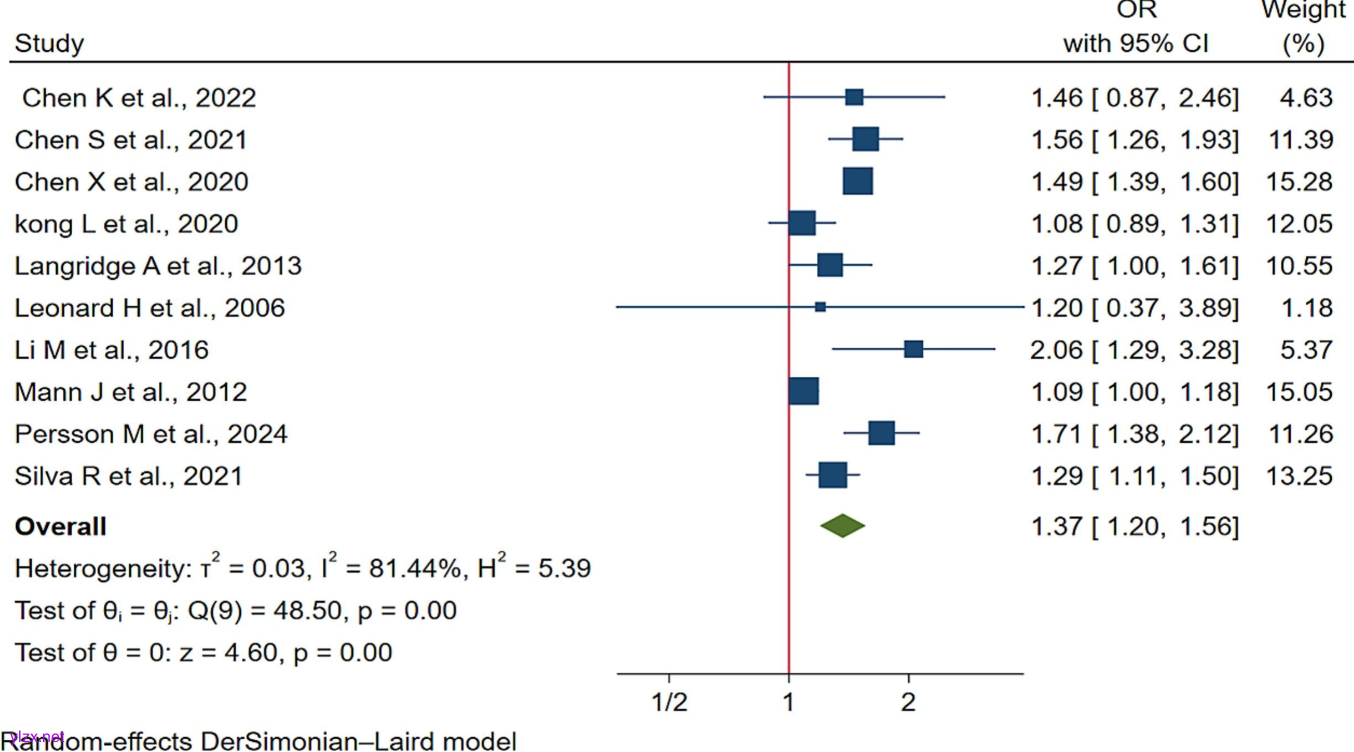 3. 诊断方法影响:基于ICD编码的研究效应量更高(OR=1.38,95% CI:1.19-1.60),而依赖教育记录的研究效应量较低(OR=1.11,95% CI:1.03-1.20)。