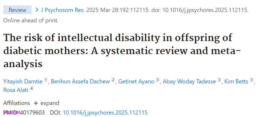 Damtie Y, Dachew BA, Ayano G, Tadesse AW, Betts K, Alati R. The risk of intellectual disability in offspring of diabetic mothers: A systematic review and meta-analysis. J Psychosom Res. 2025 Mar 28;192:112115. doi: 10.1016/j.jpsychores.2025.112115. Epub ahead of print. PMID: 40179603.