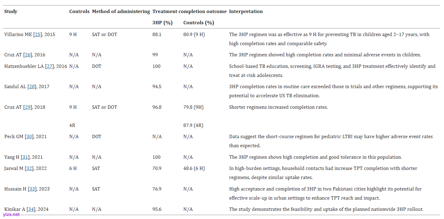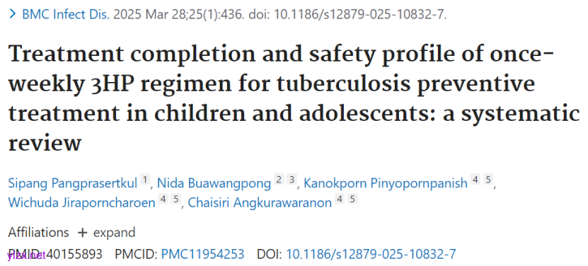 Pangprasertkul S, Buawangpong N, Pinyopornpanish K, Jiraporncharoen W, Angkurawaranon C. Treatment completion and safety profile of once-weekly 3HP regimen for tuberculosis preventive treatment in children and adolescents: a systematic review. BMC Infect Dis. 2025 Mar 28;25(1):436. doi: 10.1186/s12879-025-10832-7. PMID: 40155893; PMCID: PMC11954253.