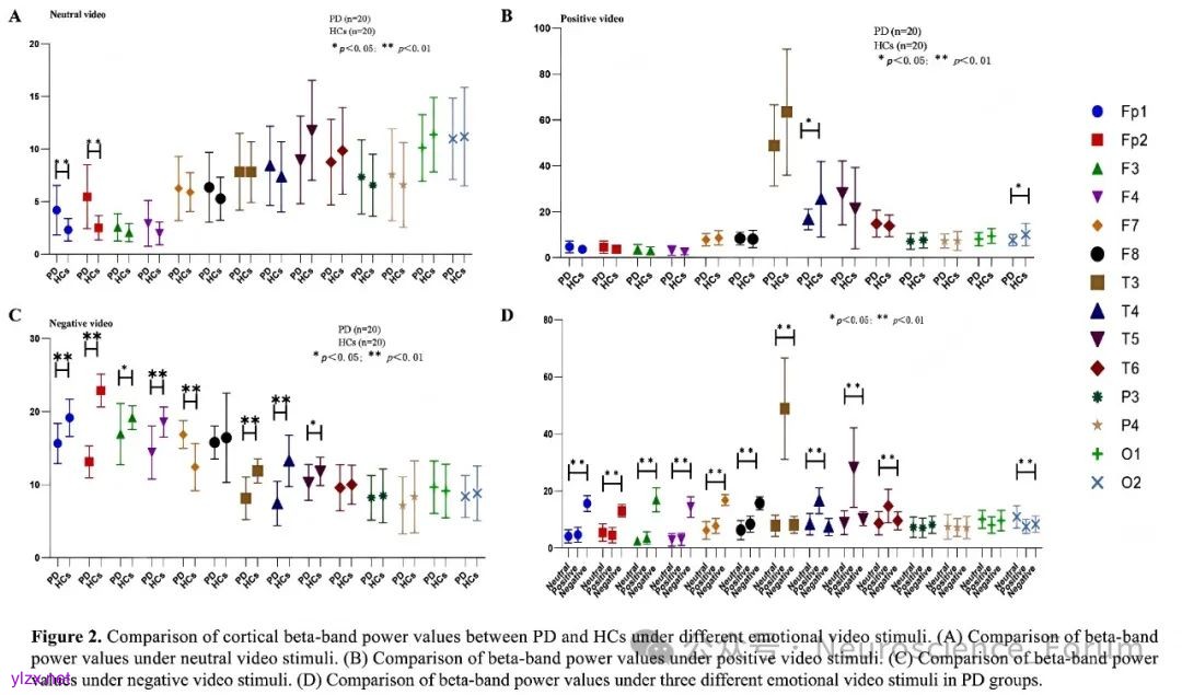 脑电图数据显示,患者在观看负面情绪视频时呈现独特的神经活动模式:前额叶(Fp1/Fp2)和颞叶(T3/T4)区域的β波段功率显著异常,提示边缘系统与运动网络整合功能失调。尤为关键的是,患者对负面情绪存在“矛盾处理”——主观愉悦度评分(valence)显示更强的负面感受,但生理唤醒度(arousal)却低于健康人群。针对这种情感认知与生理反应的分离现象,论文通讯作者王共强解释:"这种‘高情绪负价-低生理唤醒’的分离现象,可能反映边缘系统与运动网络的功能失整合,导致情绪波动‘点燃’震颤。"