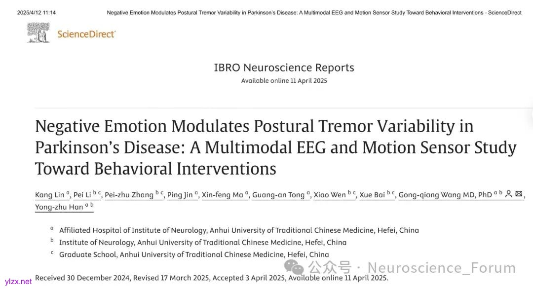 近日,安徽中医药大学神经病学研究所暨附属医院神经内科王共强课题组在帕金森病(PD)治疗领域取得重要研究突破。通过结合脑电图(EEG)与高精度运动传感器技术,研究首次揭示了负面情绪通过特定神经机制调控帕金森病患者姿势性震颤变异性的动态变化,为通过情绪行为干预改善震颤症状提供了全新科学依据。该成果以“Negative Emotion Modulates Postural Tremor Variability in Parkinson’s Disease: A Multimodal EEG and Motion Sensor Study Toward Behavioral Interventions”为题目,在线发表于国际权威期刊 IBRO Neurosci Rep(JCR:Q3,IF:2.0),第一作者林康主治医师,通讯作者王共强主任医师。IBRO Neuroscience Reports 由知名出版机构Elsevier和国际脑研究组织(IBRO)联合发行的一本聚焦于脑研究及大脑的同源学科,在学术界享有较高的关注度和专业认可度。