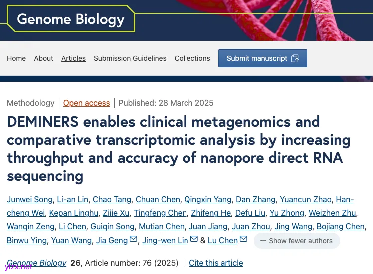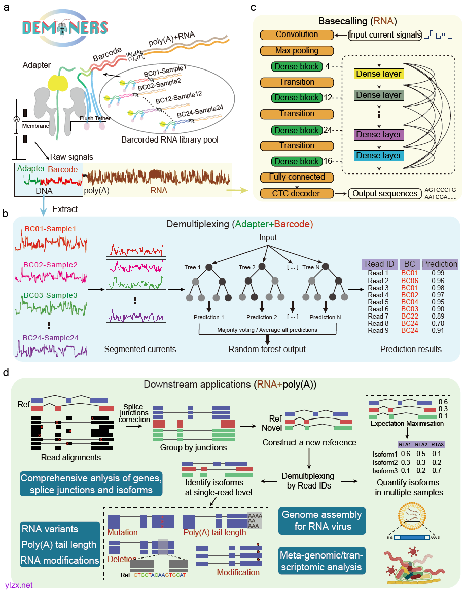近日,四川大学陈路、林静雯、耿佳团队合作在Genome Biology期刊上发表了文章“DEMINERS enables clinical metagenomics and comparative transcriptomic analysis by increasing throughput and accuracy of nanopore direct RNA sequencing”。该研究开发出一款名为DEMINERS的创新DRS测序何分析框架,突破了传统DRS技术在样本混合、碱基识别及数据分析方面的局限,实现多达24个样本的同时直接测序(图1a-b)以及高达93.54%的碱基识别准确率(图1c),并成功应用于临床转录组学、微生物组学、癌症转录组学以及不同生物条件下的转录组特征对比(图1d)。