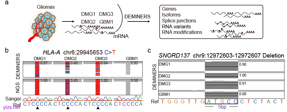 弥漫中线胶质瘤(DMG,常见于儿童中线脑区)和胶质母细胞瘤(GBM,成人侵袭性原发脑瘤)均以治疗抗性和分子异质性著称,解析其多维度调控网络是开发靶向疗法的核心挑战。DEMINERS成功分析了DMG和GBM样本中的突变、m6A修饰以及基因和剪接异构体的表达。研究发现,m6A修饰与GFAP基因的剪接异构体表达水平呈负相关关系。GFAP-214的m6A修饰水平显著高于GFAP-230,提示m6A修饰可能通过调控剪接异构体的生成进而影响胶质瘤的发生和发展。此外,DEMINERS与NGS的高一致性表明其在临床癌症研究中的应用前景(图4)。