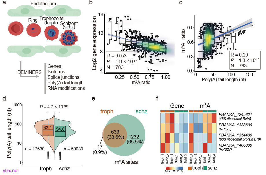 疟原虫是引起疟疾的病原体,其滋养体(trophozoite)和裂殖体(schizonts)是其红细胞内发育时期的两个关键阶段,对疟原虫致病性起决定性作用。在疟原虫的研究中,DEMINERS用于分析滋养体和裂殖体阶段的转录组特征。研究发现,裂殖体阶段的转录本具有较短的Poly(A)尾巴和更高的m6A修饰水平。65.5%的m6A修饰位点仅在裂殖体阶段存在,表明这些修饰可能与疟原虫在不同发育阶段的基因调控密切相关。此外,DEMINERS还揭示了疟原虫中多种新型可变剪接体,尤其是裂殖体阶段表现出更高的剪接多样性,为研究新的抗疟靶点提供了数据支持(图3)。