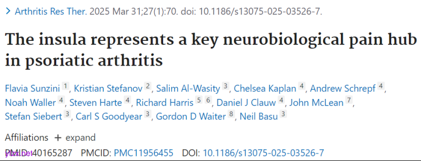 Sunzini F, Stefanov K, Al-Wasity S, Kaplan C, Schrepf A, Waller N, Harte S, Harris R, Clauw DJ, McLean J, Siebert S, Goodyear CS, Waiter GD, Basu N. The insula represents a key neurobiological pain hub in psoriatic arthritis. Arthritis Res Ther. 2025 Mar 31;27(1):70. doi: 10.1186/s13075-025-03526-7. PMID: 40165287; PMCID: PMC11956455.