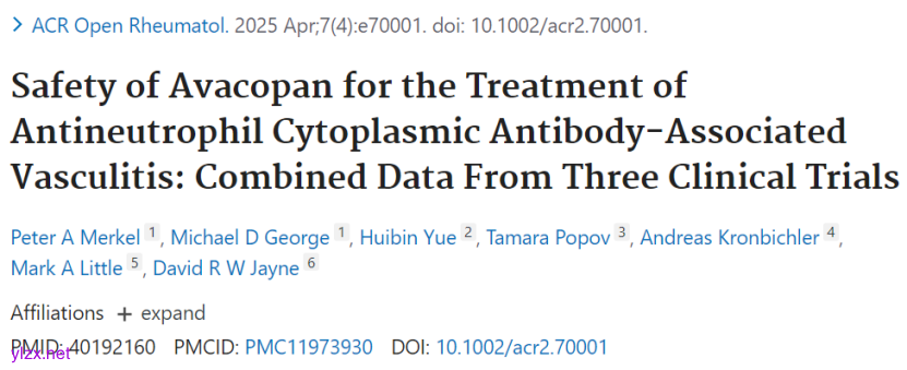 Merkel PA, George MD, Yue H, Popov T, Kronbichler A, Little MA, Jayne DRW. Safety of Avacopan for the Treatment of Antineutrophil Cytoplasmic Antibody-Associated Vasculitis: Combined Data From Three Clinical Trials. ACR Open Rheumatol. 2025 Apr;7(4):e70001. doi: 10.1002/acr2.70001. PMID: 40192160; PMCID: PMC11973930.