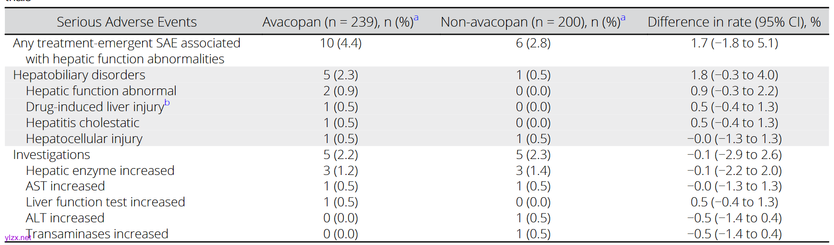 肝毒性风险:avacopan组4.4%患者发生肝毒性SAEs(非avacopan组2.8%),但无病例符合Hy’s法则的致命性肝损伤标准。血液学毒性方面,avacopan组中性粒细胞/淋巴细胞减少发生率为22.6例/100患者年,显著低于非avacopan组的34.2例(差异-11.6,95% CI -22.0至-1.2)。