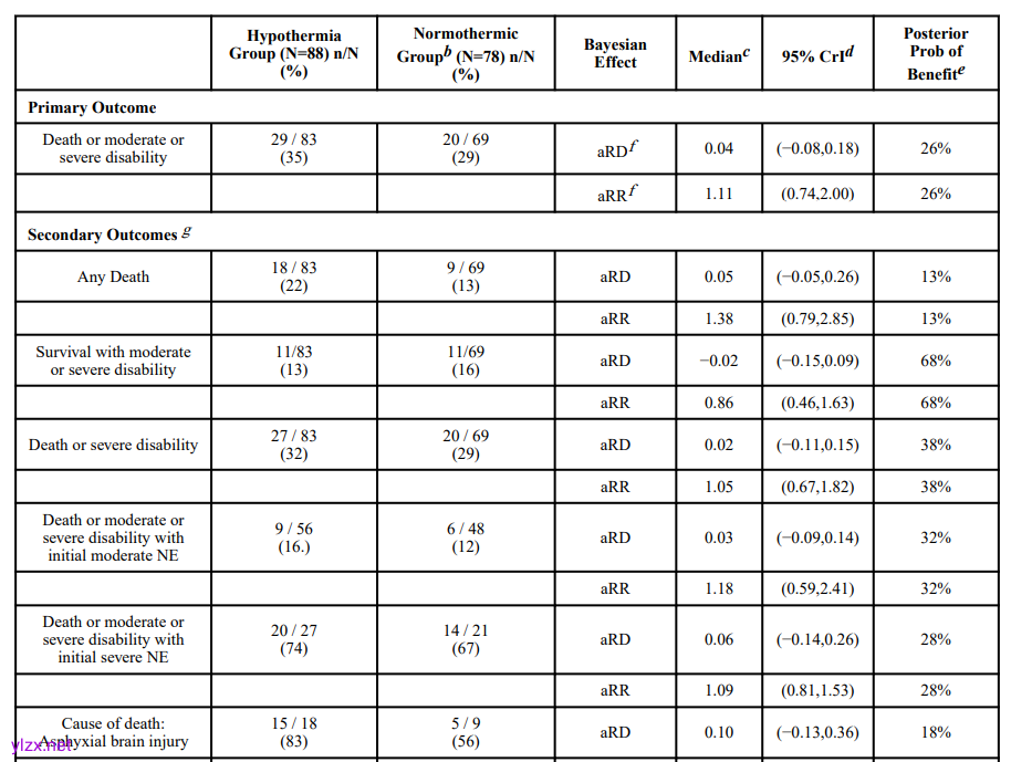 主要结局:低温组死亡或残疾发生率为35%(29/83),对照组为29%(20/69)。贝叶斯分析显示,低温组死亡或残疾风险比(aRR)为1.11(95%可信区间0.74-2.00),后验概率提示74%可能增加风险。单纯死亡风险比更高(aRR=1.38,95%可信区间0.79-2.85),后验概率达87%。