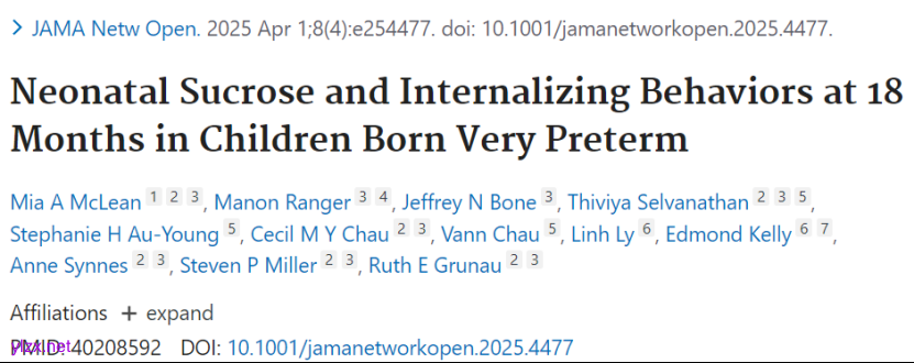 McLean MA, Ranger M, Bone JN, Selvanathan T, Au-Young SH, Chau CMY, Chau V, Ly L, Kelly E, Synnes A, Miller SP, Grunau RE. Neonatal Sucrose and Internalizing Behaviors at 18 Months in Children Born Very Preterm. JAMA Netw Open. 2025 Apr 1;8(4):e254477. doi: 10.1001/jamanetworkopen.2025.4477. PMID: 40208592.