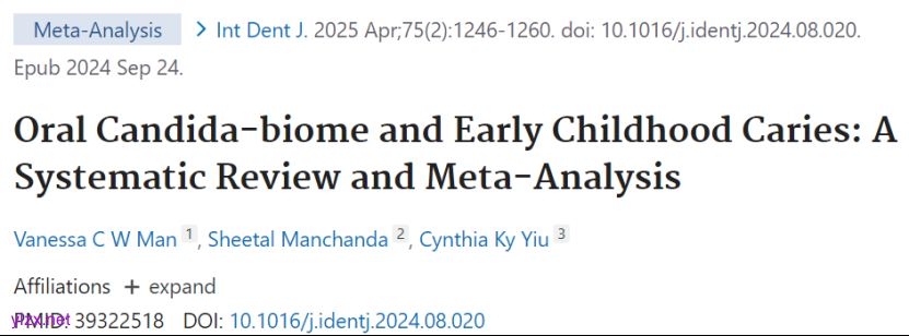 Man VCW, Manchanda S, Yiu CK. Oral Candida-biome and Early Childhood Caries: A Systematic Review and Meta-Analysis. Int Dent J. 2025 Apr;75(2):1246-1260. doi: 10.1016/j.identj.2024.08.020. Epub 2024 Sep 24. PMID: 39322518.