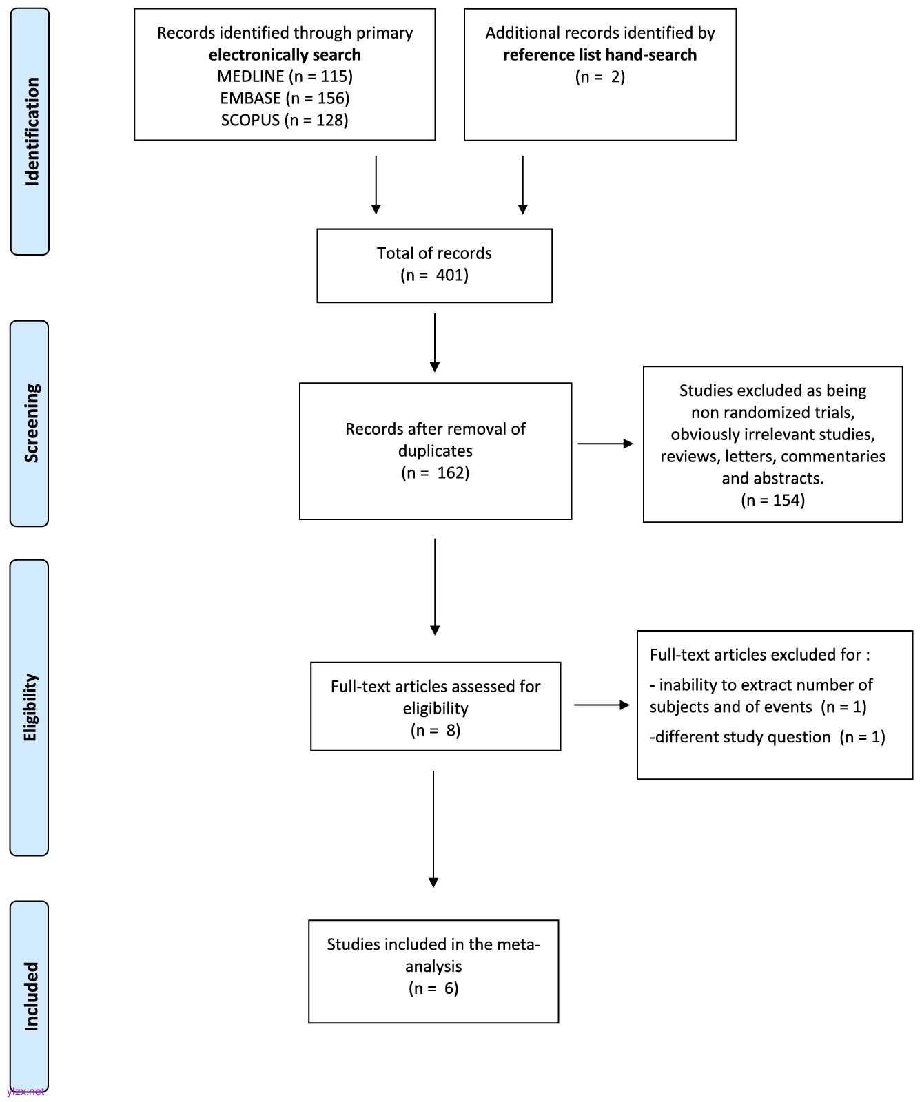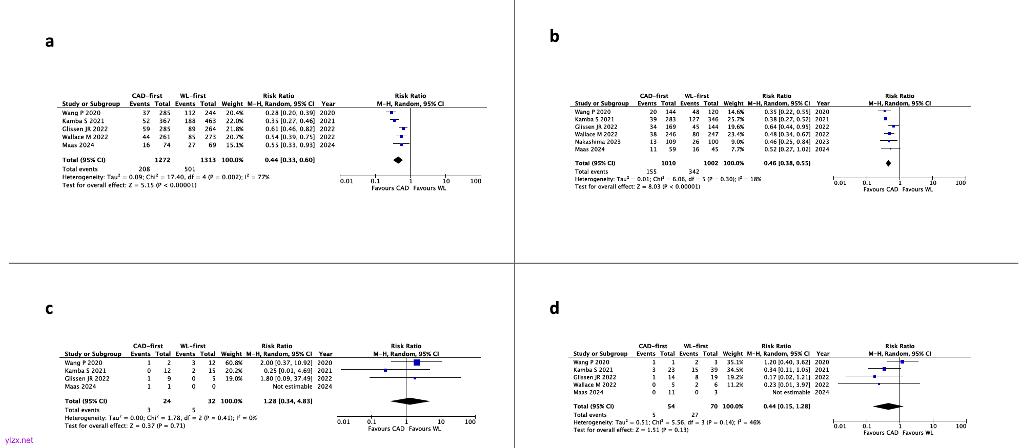研究团队检索了截至2024年5月的主要数据库,包括PubMed、Embase、Cochrane Library等,以获取所有符合要求的RCTs。纳入标准包括:(1)采用串联设计的RCTs;(2)比较了CAC和WLC在腺瘤漏诊率(AMR)和息肉漏诊率(PMR)方面的差异;(3)提供了足够的数据以计算风险比(RR)和95%置信区间(CI)。排除标准为:非随机对照试验、缺乏明确的漏诊率数据或未使用串联设计的研究。研究的主要终点为腺瘤漏诊率(AMR)和息肉漏诊率(PMR),次要终点为高级别腺瘤漏诊率(aAMR)和锯齿状病变漏诊率(SMR)。数据分析使用了随机效应模型,以计算汇总风险比(RR)及其95%置信区间。此外,研究还进行了敏感性分析,以验证结果的稳健性。最终,共有6项RCTs(涉及1718名患者)符合纳入标准,并被用于数据分析 。