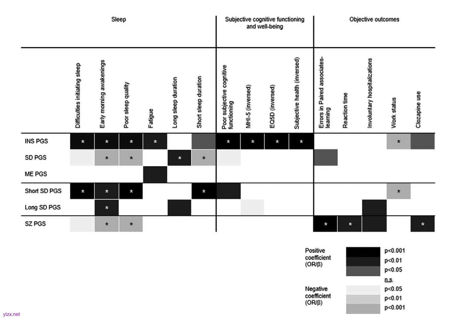 图1:多基因评分与睡眠、主观健康及认知功能的回归分析结果