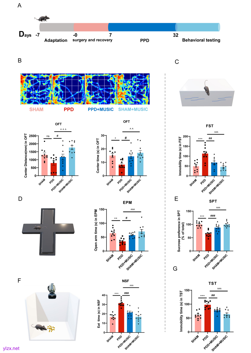 研究采用BALB/c雌性小鼠,通过双侧卵巢切除和激素注射建立PPD模型,并将小鼠分为假手术组(SHAM)、PPD模型组(PPD)、PPD+音乐干预组(PPD+Music)和仅音乐干预组(Music)。音乐干预每天进行2小时,持续23天,音量控制在70分贝左右。行为测试包括旷场实验(OFT)、强迫游泳实验(FST)、高架十字迷宫实验(EPM)、蔗糖偏好实验(SPT)、新奇抑制摄食实验(NSF)和悬尾实验(TST),以评估小鼠的抑郁和焦虑样行为。此外,研究还通过qRT-PCR、Western blot、免疫荧光和转录组测序等技术,分析了小鼠血清、海马和前额叶皮层中的氧化应激标志物、炎症因子、神经元存活及突触可塑性的变化。