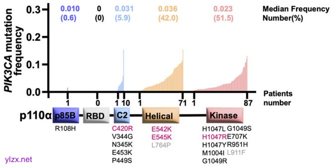 图2. 体细胞突变类型的分布PIK3CAp110α 蛋白的核心功能域及其在ccm中的突变频率