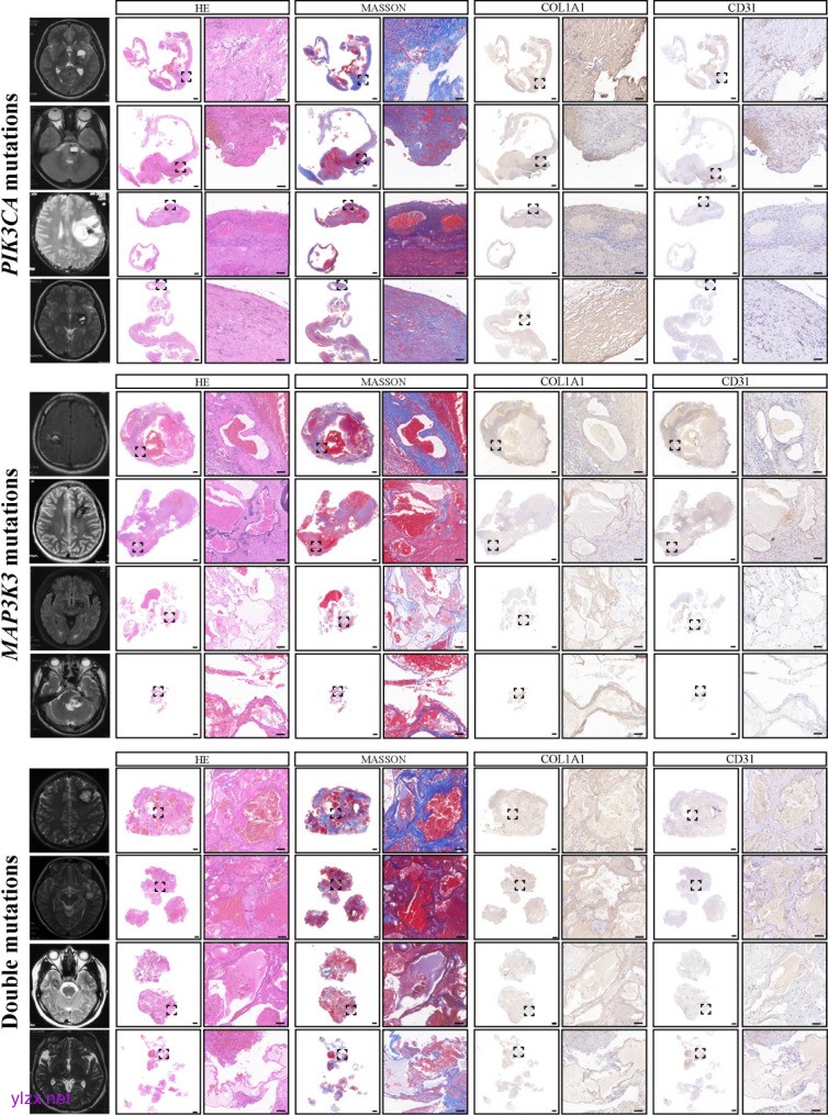 脑海绵状血管畸形(Cerebral cavernous malformations,CCM)是影响中枢神经系统的毛细血管后内皮细胞的血管疾病,其特征是毛细血管簇增大。它们是中枢神经系统中第二常见的血管畸形,其患病率约为0.16-0.4%。CCMs可以偶然出现或出现头痛,癫痫,局灶性神经功能缺损或出血等症状。有两种不同的CCM类型,包括家族性遗传和散发性形式。CCMs的遗传分析主要集中在遗传形式上,这与CCM复合体中三个功能丧失基因之一有关:KRIT1(CCM1),MGC4607(CCM2),或PDCD10(CCM3)。然而,大多数CCM病例是零星发生的。最近的研究揭示了功能获得突变在MAP3K3和PIK3CA对于CCM建议PIK3CA在临床前研究中导致CCM病变进展和出血。PIK3CA突变被确定为CCMs侵袭性病变负荷的驱动因素,雷帕霉素抑制PI3K-AKT-mTOR途径,在涉及CCMs的临床前研究中显示出希望PIK3CA突变。然而,CCMs的突变景观,以及基因组和组织病理学多样性在塑造CCMs异质性临床表现和放射学表现中的确切作用仍然不确定。