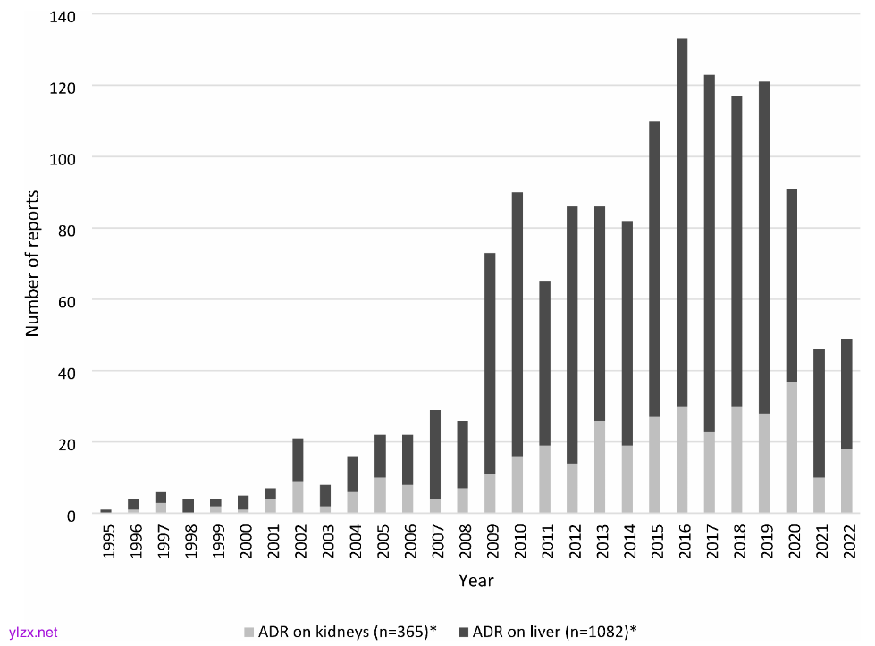 4. 时间趋势:肝脏相关ADR多发生于治疗早期(平均9.7个月),而肾脏相关ADR致死病例多见于治疗1年后(平均16.5个月)。