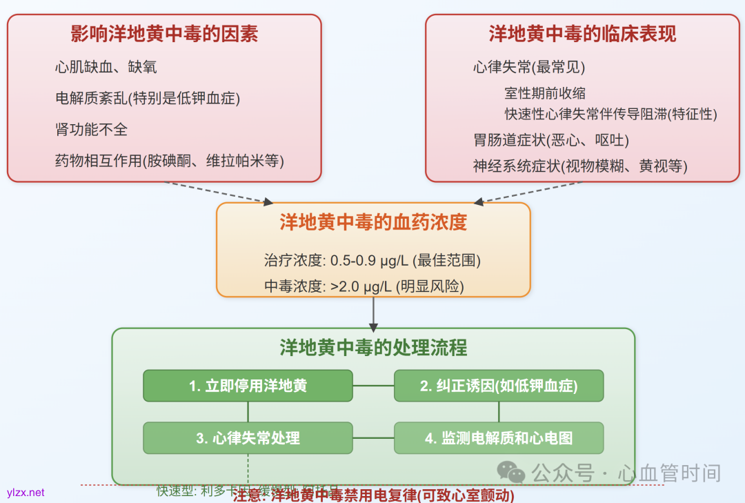 💡 笔者提示:临床中遇到洋地黄中毒,需先排除电解质紊乱特别是低钾血症。补钾治疗时需注意,严重中毒可能伴有高钾血症,此时补钾可能适得其反。另外,常规临床实践中,要特别关注老年患者使用洋地黄同时又在使用胺碘酮、维拉帕米等药物时的安全问题,必要时适当减少洋地黄剂量或加强监测。
