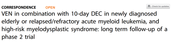 Swaminathan, M., DiNardo, C.D., Maiti, A. et al. VEN in combination with 10-day DEC in newly diagnosed elderly or relapsed/refractory acute myeloid leukemia, and high-risk myelodysplastic syndrome: long term follow-up of a phase 2 trial. Blood Cancer J. 15, 52 (2025). https://doi.org/10.1038/s41408-025-01265-1.