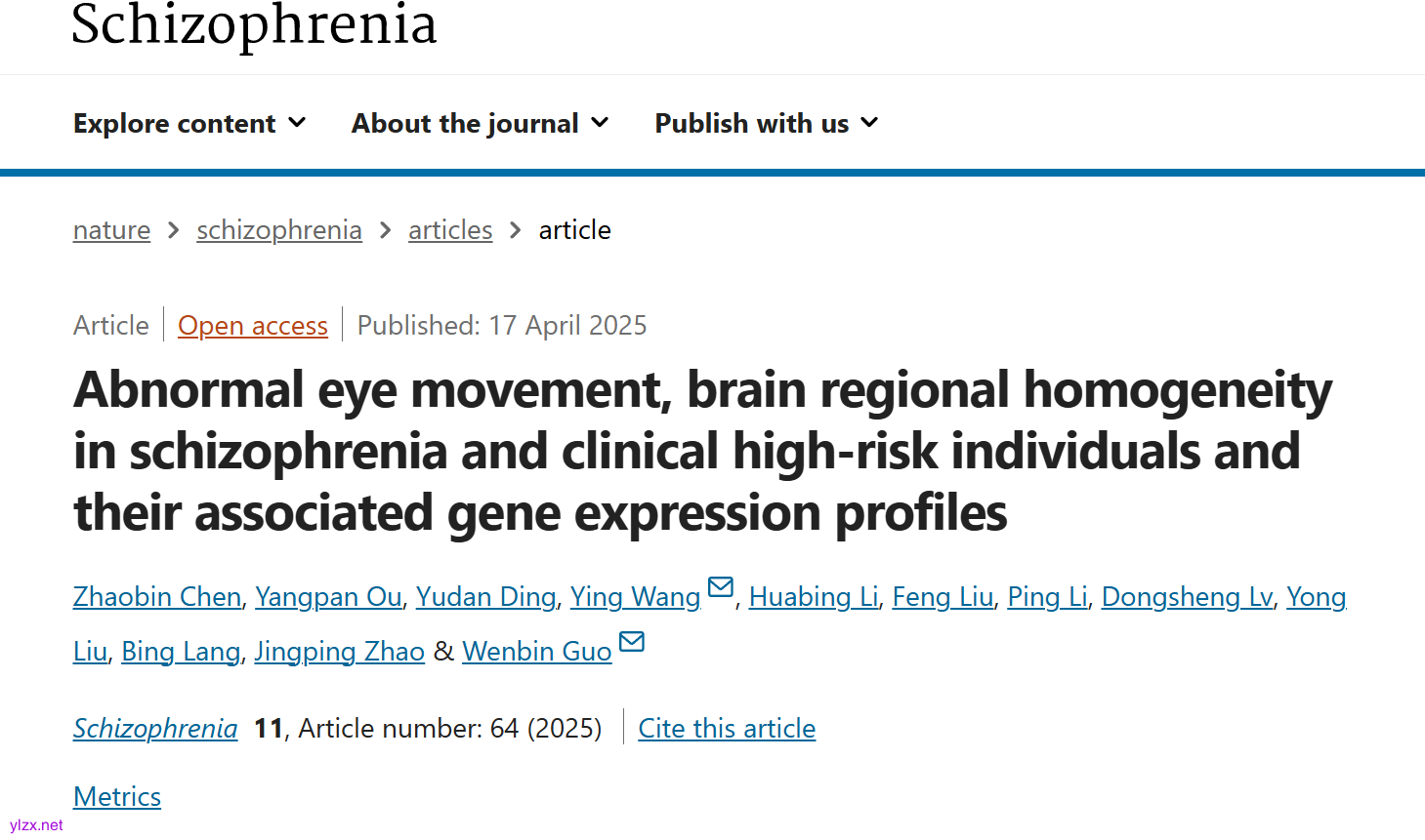 Chen, Z., Ou, Y., Ding, Y., et al. (2025). Abnormal eye movement, brain regional homogeneity in schizophrenia and clinical high-risk individuals and their associated gene expression profiles. *Schizophrenia*, 11:64. https://doi.org/10.1038/s41537-025-00609-x