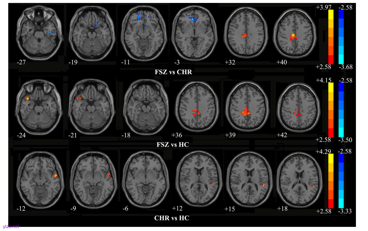 图1:FSZ、CHR和HC组间ReHo差异