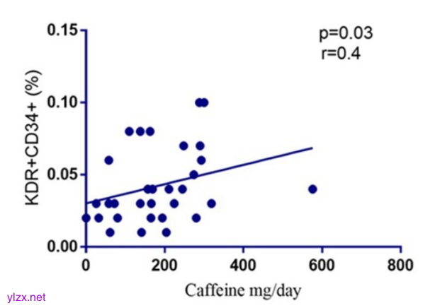 KDR+/CD34+细胞与每日咖啡因摄入量的相关性