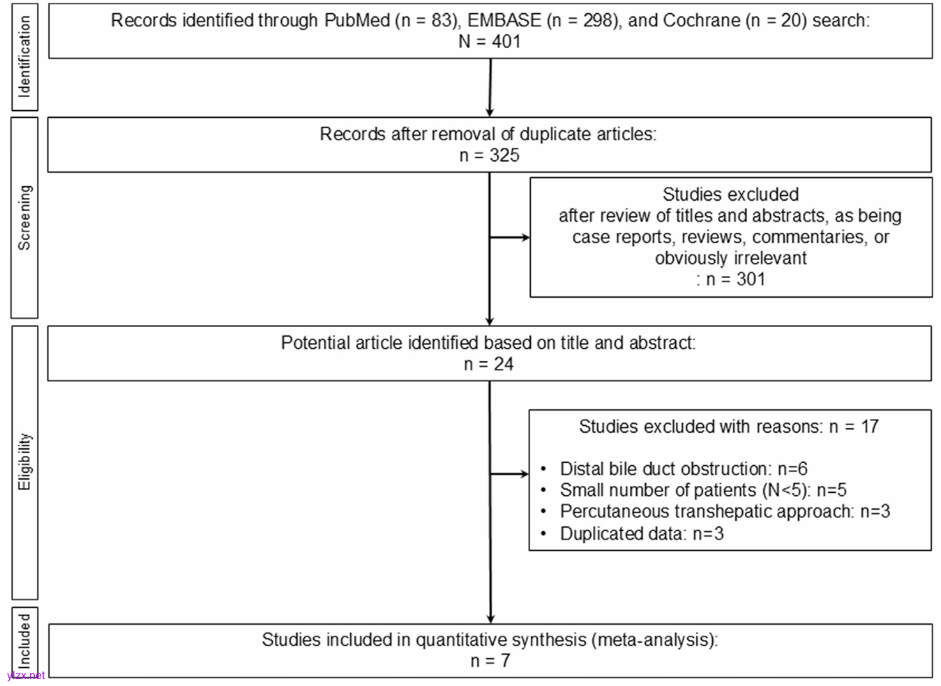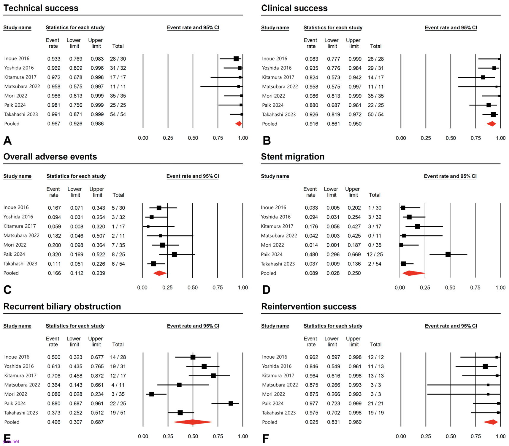 研究团队对PubMed、EMBASE和Cochrane Library数据库进行了系统的文献检索,时间范围截至2024年3月31日。纳入标准包括:①研究对象为成年MHBO患者;②患者接受了CSEMS置入术;③研究报告了技术成功率、临床成功率以及不良事件发生率等关键指标。数据提取后,采用随机效应模型进行综合统计分析。研究还评估了异质性和发表偏倚,并通过敏感性分析验证结果的稳健性。最终,从401篇初始文献中筛选出7项符合条件的研究,这些研究的质量和数据完整性均符合荟萃分析的要求。