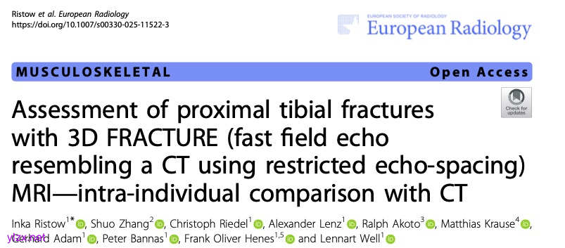Inka Ristow,Shuo Zhang,Christoph Riedel,et al.Assessment of proximal tibial fractures with 3D FRACTURE (fast field echo resembling a CT using restricted echo-spacing) MRI-intra-individual comparison with CT.DOI:10.1007/s00330-025-11522-3
