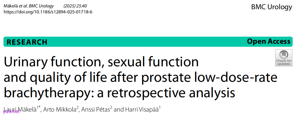 Mäkelä L, Mikkola A, Pétas A, Visapää H. Urinary function, sexual function and quality of life after prostate low-dose-rate brachytherapy: a retrospective analysis. BMC Urol. 2025 Feb 28;25(1):40. doi: 10.1186/s12894-025-01718-6. PMID: 40022028; PMCID: PMC11869719.