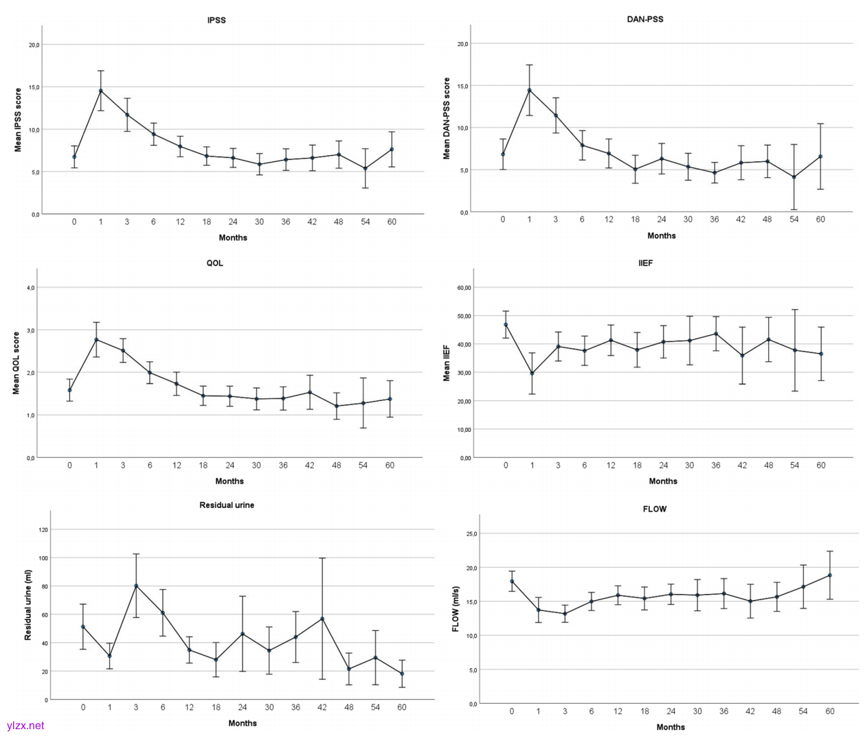 结果显示,中位随访时间为36个月(四分位间距为12–54个月)。患者中位年龄为62岁(四分位间距为57–66岁)。在基线时,大多数患者的尿路症状评分较低,且尿路功能良好。然而,有5名患者的基线IPSS超过20分,表明存在严重的尿路症状。13名患者的尿流率低于10毫升/秒。11名患者的残余尿量大于100毫升,且前列腺体积越大,残余尿量就越多(皮尔逊相关系数=0.269,p=0.021)。由于这些患者属于低危和中危患者,因此很少使用辅助激素治疗。基线时IIEF总评分的中位数为57.5分(四分位间距为28–64分),表明基线时患者的性健康状况相对较好。在1个月、3个月和6个月时,IPSS、生活质量(QOL)评分、IIEF评分均出现具有统计学显著性(p<0.004)的恶化。DAN-PSS在1个月和3个月时出现具有统计学显著性的变化。6个月后,患者报告的尿路症状和生活质量有所改善,这些评分在12个月时恢复至基线水平。在尿流率测定中,直至18个月的各个时间点,与基线相比的变化均具有统计学显著性。排尿后残余尿量仅在1个月、12个月和18个月时与基线相比的变化具有统计学显著性。患者报告的结局指标与尿流率测定评估的排尿功能之间存在轻微差异。