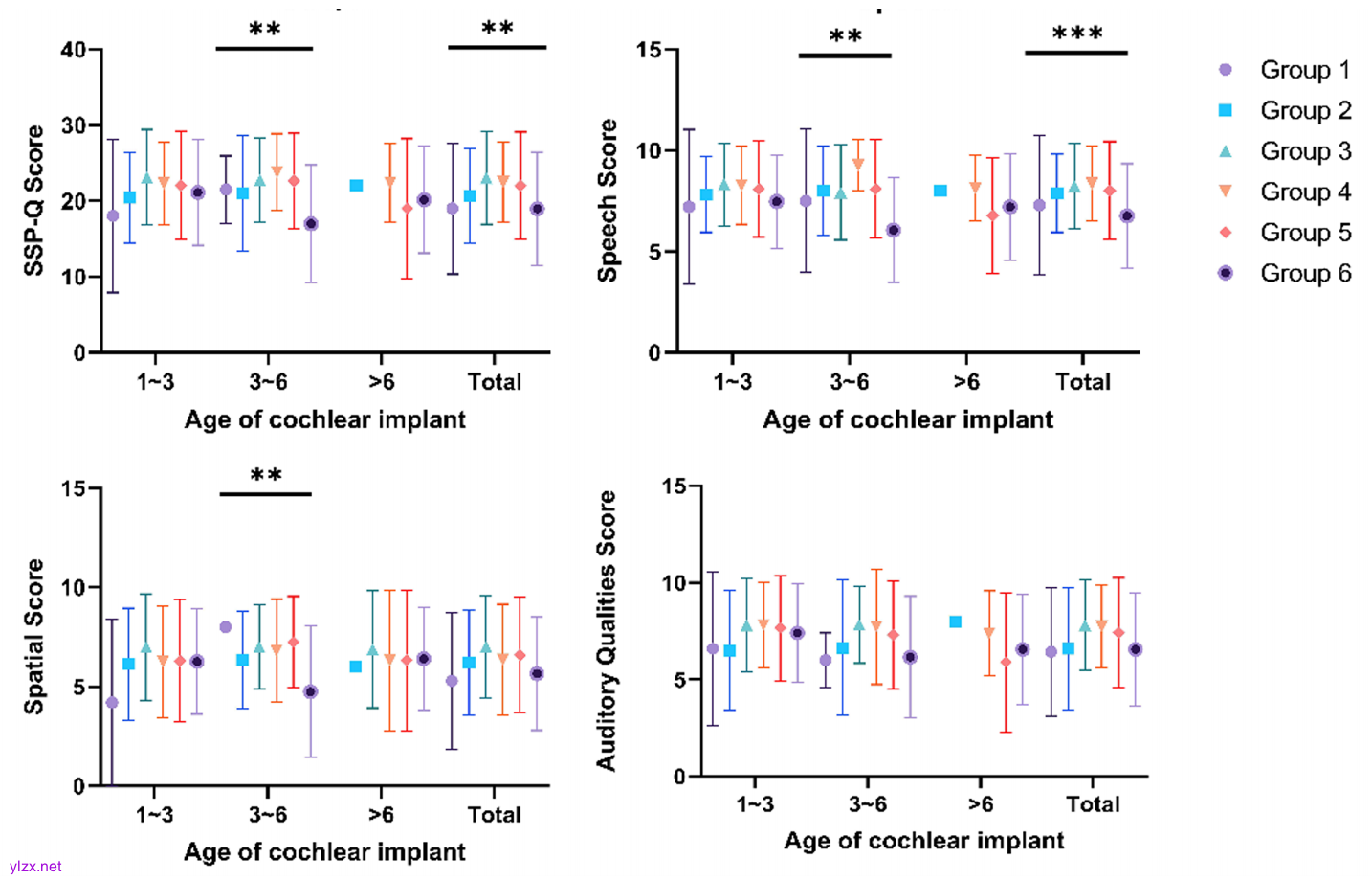 研究人员将406名1至13岁的听力受损患者分为六组:1-3岁组(7人)、3-5岁组(34人)、5-7岁组(62人)、7-9岁组(94人)、9-11岁组(138人)和11-13岁组(71人)。研究人员使用听觉表现分类(CAP)、言语可懂度评级(SIR)和中文版言语、空间和其他听觉质量量表-家长版(SSQ-P)评估听觉言语能力和言语空间听觉质量,并比较了耳蜗植入患者开机后1-3年、3-5年、5-7年、7-9年、9-11年和11-13年的听觉和言语能力。