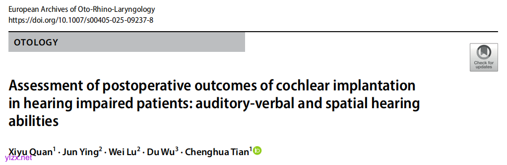 Quan X, Ying J, Lu W, Wu D, Tian C. Assessment of postoperative outcomes of cochlear implantation in hearing impaired patients: auditory-verbal and spatial hearing abilities. Eur Arch Otorhinolaryngol. 2025 Mar 7. doi: 10.1007/s00405-025-09237-8. Epub ahead of print. PMID: 40053091.